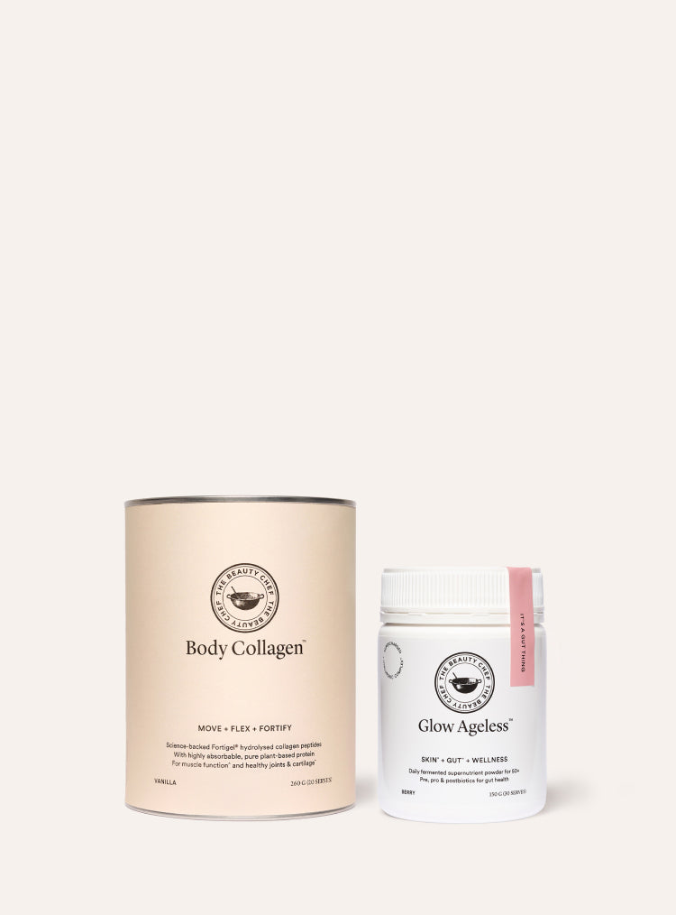 Glow Ageless™: A fermented supernutrient powder made specifically for people aged 50+. This delicious berry-flavoured blend contains 200% RDI of vitamin C for collagen production, 51% RDI of zinc for healthy hair & nails, 25% RDI of magnesium for bone health, as well as iodine for thyroid health. With pre, pro & postibiotics, vitamin D and 11 Certified Organic wholefoods including maqui berries and queen garnet plum, it’s a daily drinkable habit for glowing skin, gut health and whole-body wellness. Supercharged with our exclusive Hyaluronic Complex™—antioxidant-rich blend of sea buckthorn, grapeseed extract & hyaluronic acid for your glowiest results yet.