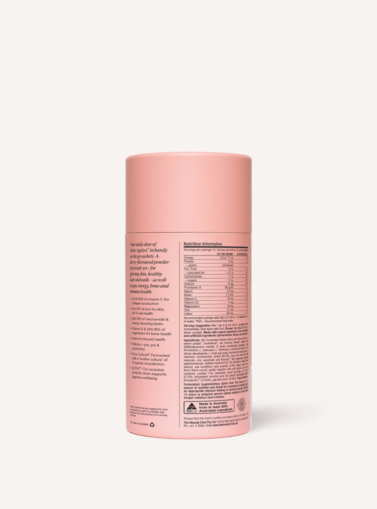 For optimal results, Glow Ageless™ should be consumed daily in chilled or room temperature beverages and can be taken with any other Beauty Chef product.