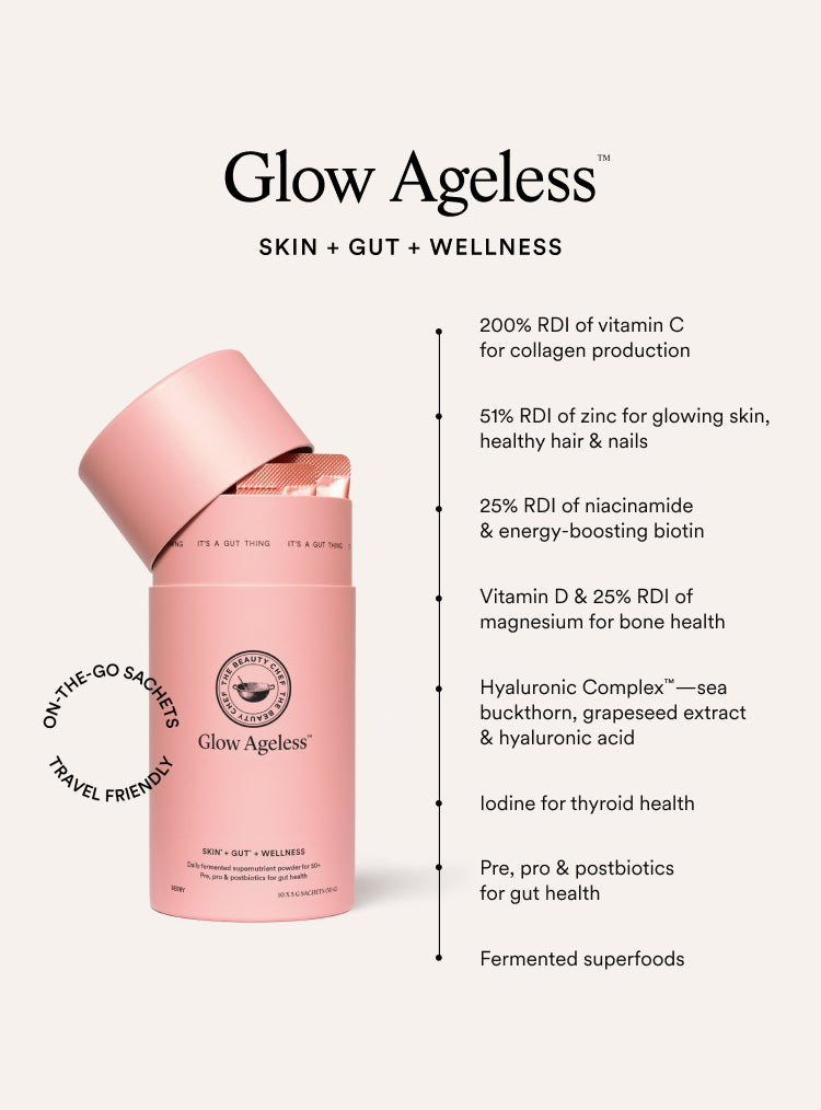 Fermented using our exclusive Flora Culture® process, Glow Ageless™ contains natural broad-spectrum pre, pro and postbiotics to support digestive health.