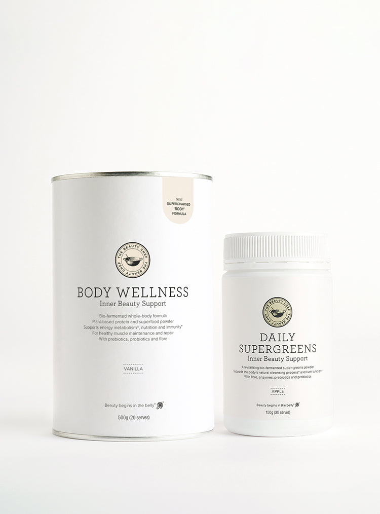 DAILY SUPERGREENS Inner Beauty Support: Enliven your everyday with our revitalising supergreens powder formulated to aid fat metabolism and liver function and provide a daily source of fibre. Support the body’s natural cleansing process while digestive enzymes, prebiotics and probiotics support a healthy belly.