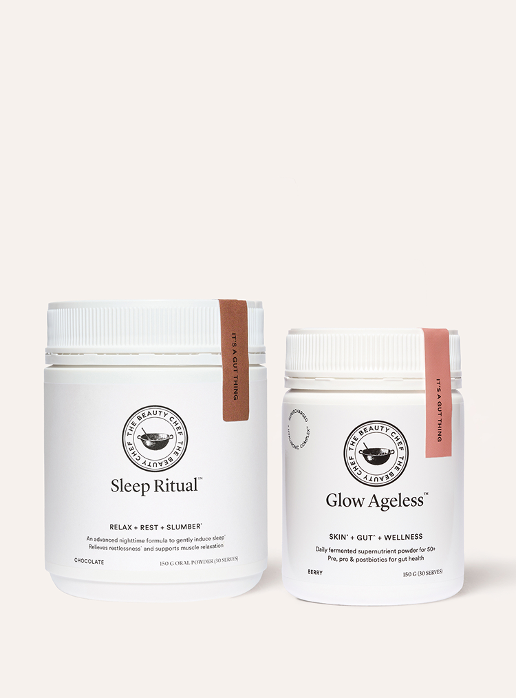 Ease into sleep every evening while radiating skin, gut & whole-body wellness every day. Pair our powerfully targeted sleep powder with Glow Ageless™—made for those 50+ with added bone & thyroid support.